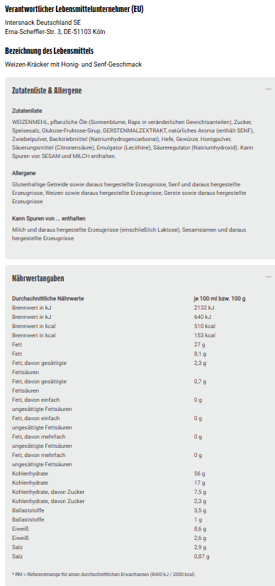 Zutaten: WEIZENMEHL, pflanzliche Öle (Sonnenblume, Raps in veränderlichen Gewichtsanteilen), Zucker, Speisesalz, Glukose-Fruktose-Sirup, GERSTENMALZEXTRAKT, natürliches Aroma (enthält SENF), Zwiebelpulver, Backtriebmittel (Natriumhydrogencarbonat), Hefe, Gewürze, Honigpulver, Säuerungsmittel (Citronensäure), Emulgator (Lecithine), Säureregulator (Natriumhydroxid). Kann Spuren von SESAM und MILCH enthalten.