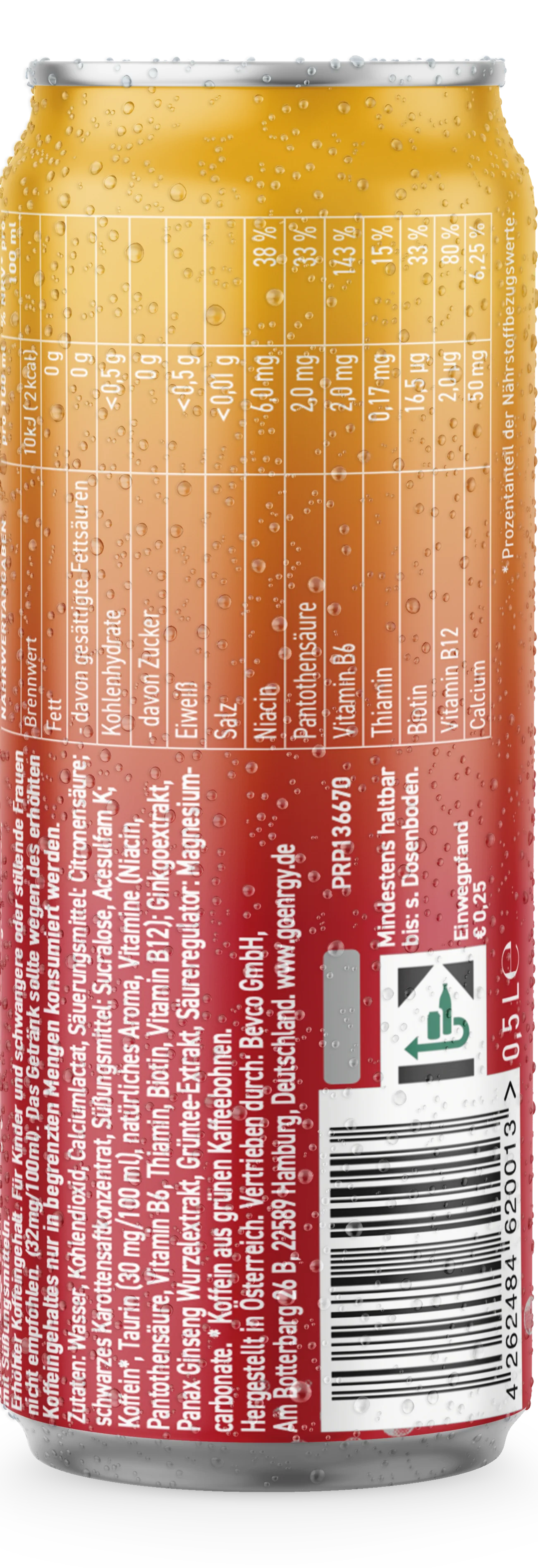 Zutaten: Wasser, Kohlensäure, Säuerungsmittel: Citronensäure; Calciumlactat, Süßungsmittel: Sucralose, Acesulfam K; Koffein*, Taurin (30mg/100ml), Aroma, färbendes Konzentrat (Schwarze Karotte), Vitamine (Niacin, Pantothensäure, Vitamin B6, Thiamin, Biotin, Vitamin B12); Ginkgoextrakt, Panax Ginseng Wurzelextrakt, Grüntee-Extrakt, Säureregulator: Magnesiumcarbonate; Farbstoff: Riboflavine. * Koffein aus grünen Kaffeebohnen.