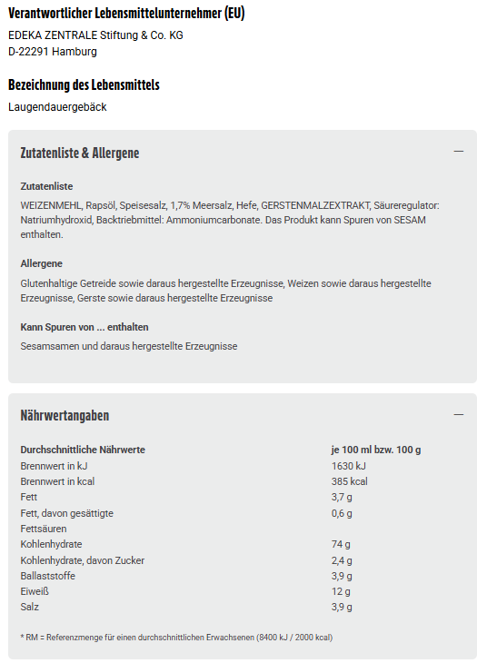 WEIZENMEHL, Rapsöl, Speisesalz, 1,7% Meersalz, Hefe, GERSTENMALZEXTRAKT, Säureregulator: Natriumhydroxid, Backtriebmittel: Ammoniumcarbonate. Das Produkt kann Spuren von SESAM enthalten.