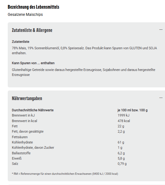 78% Mais, 19% Sonnenblumenöl, 0,8% Speisesalz. Das Produkt kann Spuren von GLUTEN und SOJA enthalten.