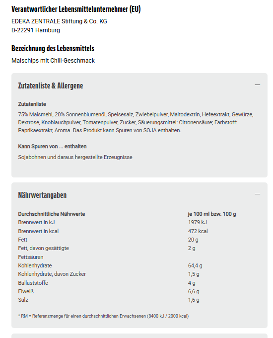 75% Maismehl, 20% Sonnenblumenöl, Speisesalz, Zwiebelpulver, Maltodextrin, Hefeextrakt, Gewürze, Dextrose, Knoblauchpulver, Tomatenpulver, Zucker, Säuerungsmittel: Citronensäure; Farbstoff: Paprikaextrakt; Aroma. Das Produkt kann Spuren von SOJA enthalten.