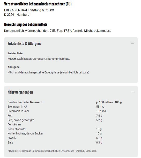 Kondensmilch, wärmebehandelt, 7,5% Fett, 17,5% fettfreie Milchtrockenmasse
