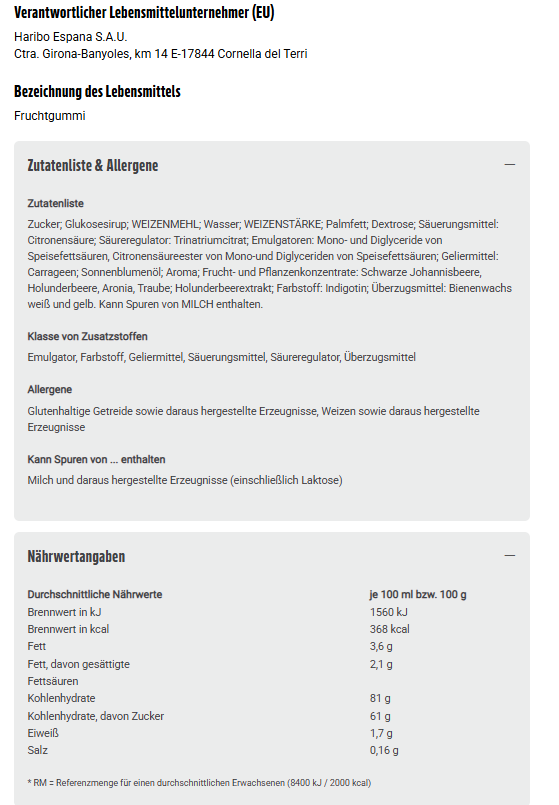 Zucker; Glukosesirup; WEIZENMEHL; Wasser; WEIZENSTÄRKE; Palmfett; Dextrose; Säuerungsmittel: Citronensäure; Säureregulator: Trinatriumcitrat; Emulgatoren: Mono- und Diglyceride von Speisefettsäuren, Citronensäureester von Mono-und Diglyceriden von Speisefettsäuren; Geliermittel: Carrageen; Sonnenblumenöl; Aroma; Frucht- und Pflanzenkonzentrate: Schwarze Johannisbeere, Holunderbeere, Aronia, Traube; Holunderbeerextrakt; Farbstoff: Indigotin; Überzugsmittel: Bienenwachs weiß und gelb. Kann Spuren von MILCH enthalten.