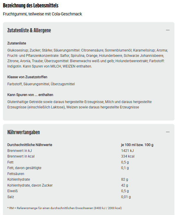 Glukosesirup; Zucker; Stärke; Säuerungsmittel: Citronensäure; Sonnenblumenöl; Karamellsirup; Aroma; Frucht- und Pflanzenkonzentrate: Saflor, Spirulina, Orange, Holunderbeere, Schwarze Johannisbeere, Zitrone, Aronia, Traube; Überzugsmittel: Bienenwachs weiß und gelb; Holunderbeerextrakt; Farbstoff: Indigotin. Kann Spuren von MILCH, WEIZEN enthalten.