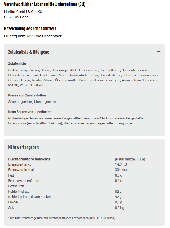 Glukosesirup; Zucker; Stärke; Säuerungsmittel: Citronensäure; Karamellsirup; Sonnenblumenöl; Holunderbeerextrakt; Frucht- und Pflanzenkonzentrate: Saflor, Holunderbeere, Schwarze Johannisbeere, Orange, Aronia, Traube, Zitrone; Überzugsmittel: Bienenwachs weiß und gelb; Aroma. Kann Spuren von MILCH, WEIZEN enthalten.