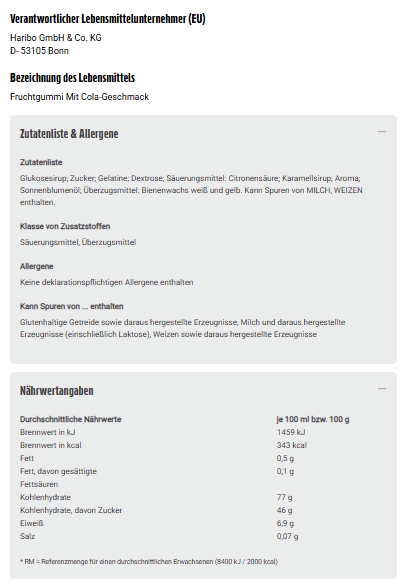 Glukosesirup; Zucker; Gelatine; Dextrose; Säuerungsmittel: Citronensäure; Karamellsirup; Aroma; Sonnenblumenöl; Überzugsmittel: Bienenwachs weiß und gelb. Kann Spuren von MILCH, WEIZEN enthalten.