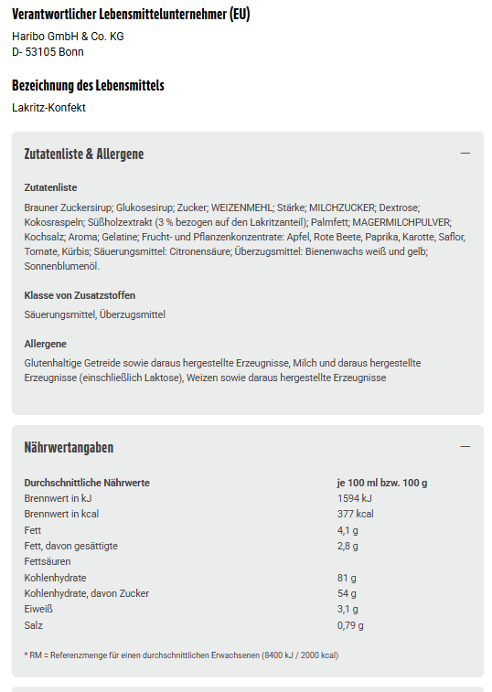 Brauner Zuckersirup; Glukosesirup; Zucker; WEIZENMEHL; Stärke; MILCHZUCKER; Dextrose; Kokosraspeln; Süßholzextrakt (3 % bezogen auf den Lakritzanteil); Palmfett; MAGERMILCHPULVER; Kochsalz; Aroma; Gelatine; Frucht- und Pflanzenkonzentrate: Apfel, Rote Beete, Paprika, Karotte, Saflor, Tomate, Kürbis; Säuerungsmittel: Citronensäure; Überzugsmittel: Bienenwachs weiß und gelb; Sonnenblumenöl.