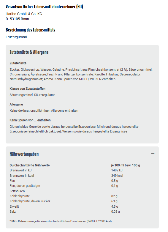 Zucker; Glukosesirup; Wasser; Gelatine; Pfirsichsaft aus Pfirsichsaftkonzentrat (2 %); Säuerungsmittel: Citronensäure, Äpfelsäure; Frucht- und Pflanzenkonzentrate: Karotte, Hibiskus; Säureregulator: Natriumhydrogenmalat; Aroma. Kann Spuren von MILCH, WEIZEN enthalten.