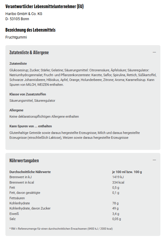 Glukosesirup; Zucker; Stärke; Gelatine; Säuerungsmittel: Citronensäure, Äpfelsäure; Säureregulator: Natriumhydrogenmalat; Frucht- und Pflanzenkonzentrate: Karotte, Saflor, Spirulina, Rettich, Süßkartoffel, Schwarze Johannisbeere, Hibiskus, Apfel, Orange, Holunderbeere, Zitrone; Aroma; Karamellsirup. Kann Spuren von MILCH, WEIZEN enthalten.