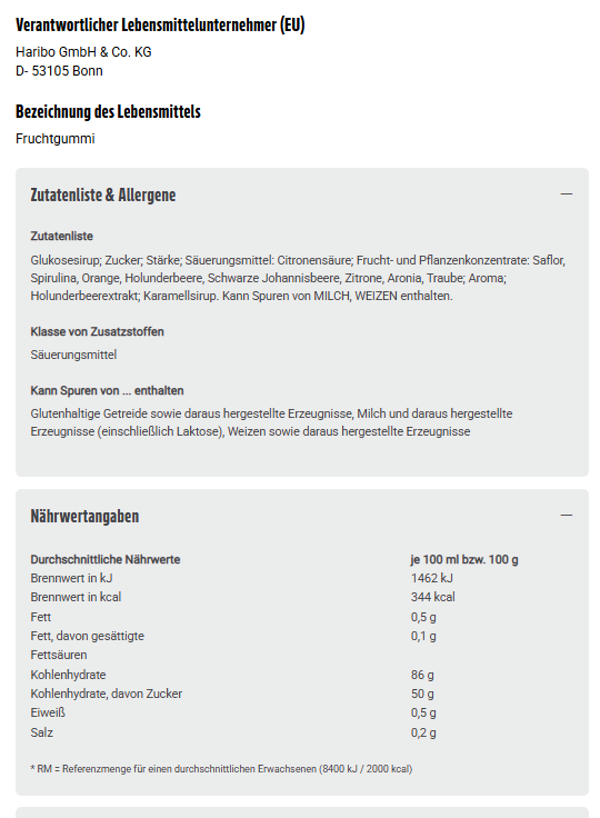 Zutaten: Glukosesirup; Zucker; Stärke; Säuerungsmittel: Citronensäure; Frucht- und Pflanzenkonzentrate: Saflor, Spirulina, Orange, Holunderbeere, Schwarze Johannisbeere, Zitrone, Aronia, Traube; Aroma; Holunderbeerextrakt; Karamellsirup. Kann Spuren von MILCH, WEIZEN enthalten.