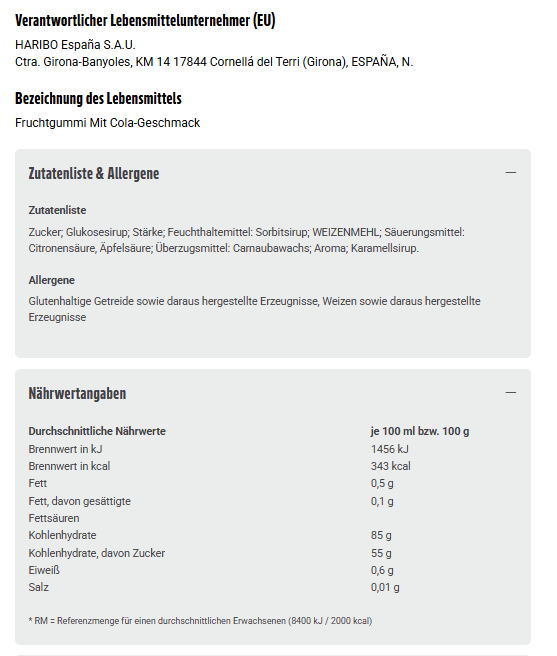 Zucker; Glukosesirup; Stärke; Feuchthaltemittel: Sorbitsirup; WEIZENMEHL; Säuerungsmittel: Citronensäure, Äpfelsäure; Überzugsmittel: Carnaubawachs; Aroma; Karamellsirup.