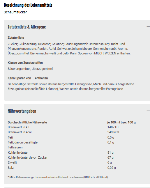 Zucker; Glukosesirup; Dextrose; Gelatine; Säuerungsmittel: Citronensäure; Frucht- und Pflanzenkonzentrate: Rettich, Apfel, Schwarze Johannisbeere; Sonnenblumenöl; Aroma; Überzugsmittel: Bienenwachs weiß und gelb. Kann Spuren von MILCH, WEIZEN enthalten.