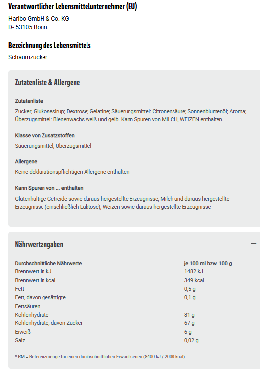 Zucker; Glukosesirup; Dextrose; Gelatine; Säuerungsmittel: Citronensäure; Sonnenblumenöl; Aroma; Überzugsmittel: Bienenwachs weiß und gelb. Kann Spuren von MILCH, WEIZEN enthalten.