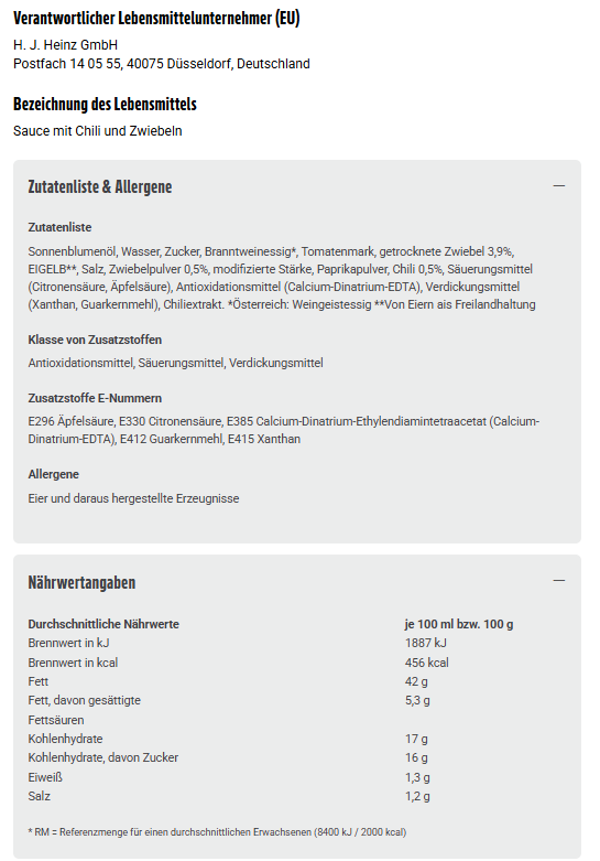 Sonnenblumenöl, Wasser, Zucker, Branntweinessig*, Tomatenmark, getrocknete Zwiebel 3,9%, EIGELB**, Salz, Zwiebelpulver 0,5%, modifizierte Stärke, Paprikapulver, Chili 0,5%, Säuerungsmittel (Citronensäure, Äpfelsäure), Antioxidationsmittel (Calcium-Dinatrium-EDTA), Verdickungsmittel (Xanthan, Guarkernmehl), Chiliextrakt. *Österreich: Weingeistessig **Von Eiern ais Freilandhaltung