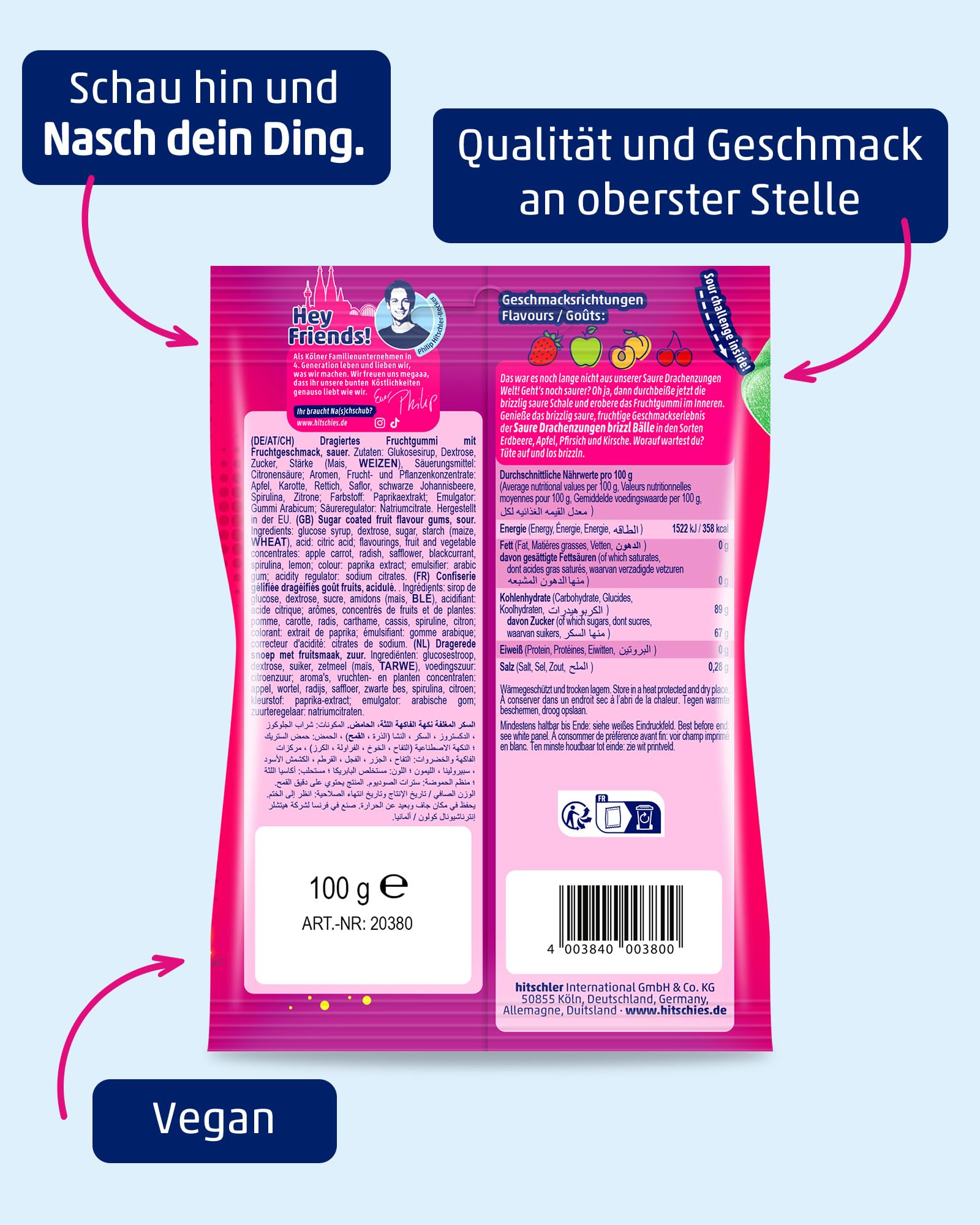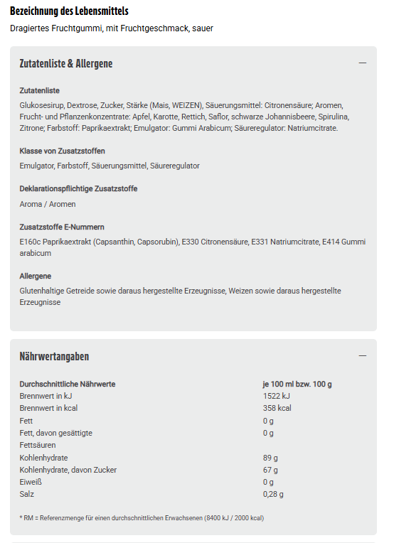Glukosesirup, Dextrose, Zucker, Stärke (Mais, WEIZEN), Säuerungsmittel: Citronensäure; Aromen, Frucht- und Pflanzenkonzentrate: Apfel, Karotte, Rettich, Saflor, schwarze Johannisbeere, Spirulina, Zitrone; Farbstoff: Paprikaextrakt; Emulgator: Gummi Arabicum; Säureregulator: Natriumcitrate.