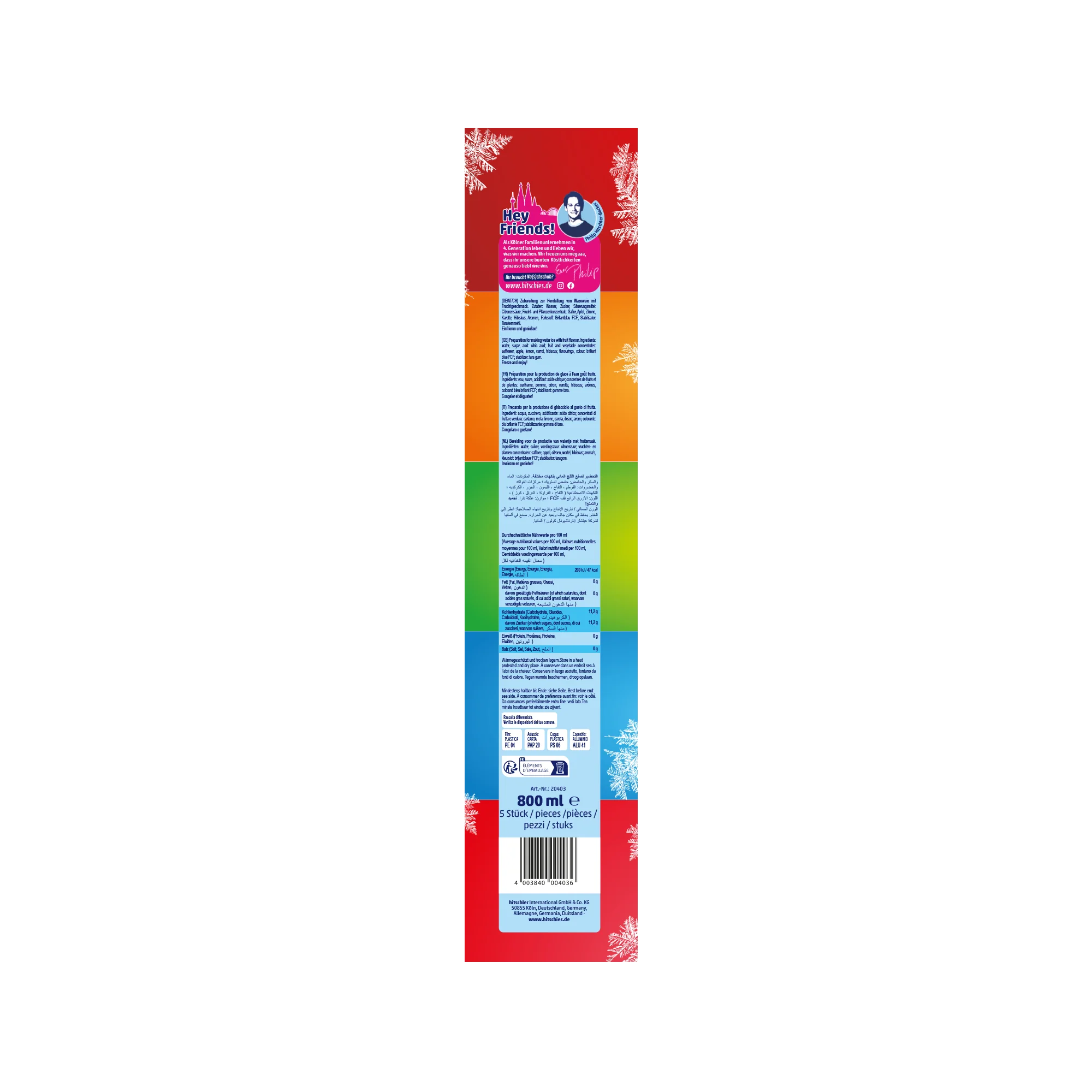 Wasser, Zucker, Säuerungsmittel: Citronensäure; Frucht- und Pflanzenkonzentrate: Saflor, Apfel, Zitrone, Karotte, Hibiskus; Aromen, Farbstoff: Brillantblau FCF; Stabilisator: Tarakernmehl. Einfrieren und genießen!