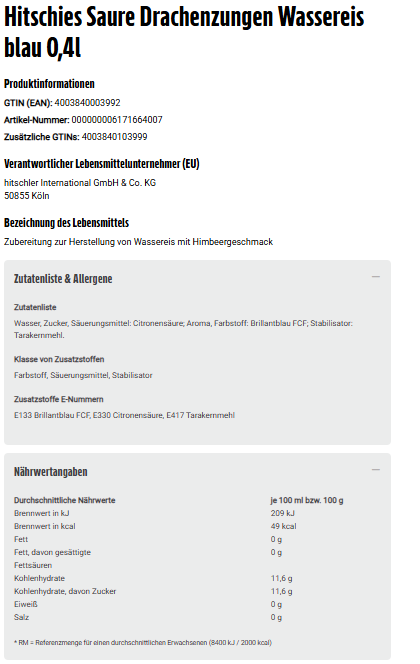Wasser, Zucker, Säuerungsmittel: Citronensäure; Aroma, Farbstoff: Brillantblau FCF; Stabilisator: Tarakernmehl.