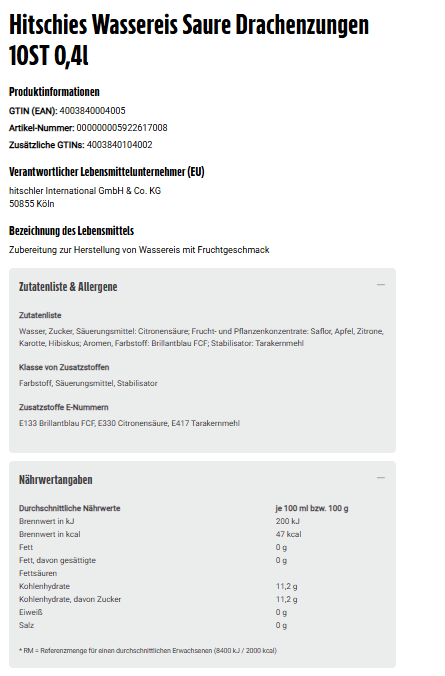E133 Brillantblau FCF, E330 Citronensäure, E417 Tarakernmehl