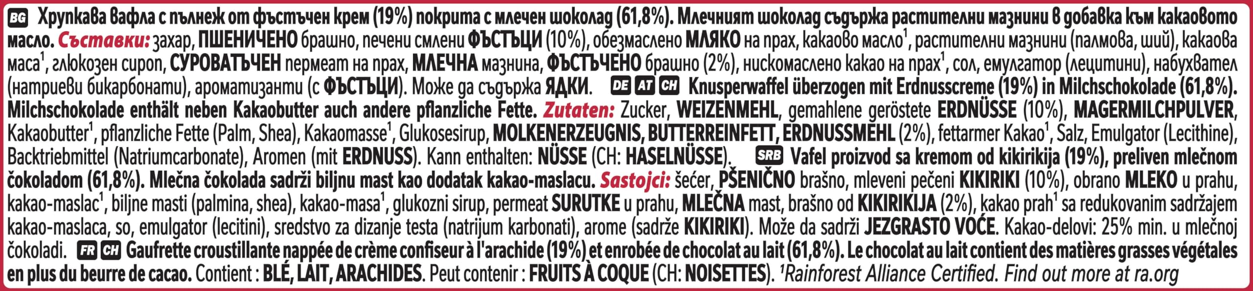 Knusperwaffel (19,8%) überzogen mit Erdnusscreme (19,8%) in Milchschokolade (60,4%)
