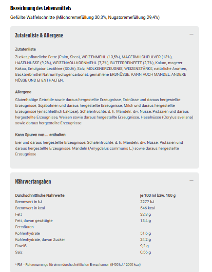 Glutenhaltige Getreide sowie daraus hergestellte Erzeugnisse, Erdnüsse und daraus hergestellte Erzeugnisse, Sojabohnen und daraus hergestellte Erzeugnisse, Milch und daraus hergestellte Erzeugnisse (einschließlich Laktose), Schalenfrüchte, d. h. Mandeln, div. Nüsse, Pistazien und daraus hergestellte Erzeugnisse, Weizen sowie daraus hergestellte Erzeugnisse, Haselnüsse (Corylus avellana) sowie daraus hergestellte Erzeugnisse