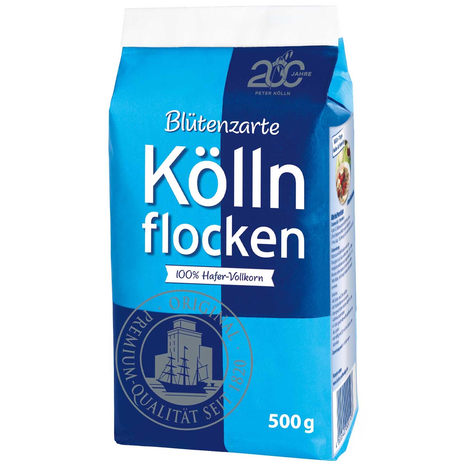 xDer Klassiker in blau-blauen Packung. Kölln Flocken Blütenzart war eines der ersten Produkte des Elmshorner Müsli-Produzenten und ist auch heute noch aus der Küche nicht mehr wegzudenken. Die feinen Vollkorn-Haferflocken sind nämlich aus dem ganzen Korn hergestellt, so dass sämtliche Nähr- und Mineralstoffe sowie das Eiweiß und Vitamin B1 erhalten bleiben. Die leckeren Flocken sind außerdem äußert vielseitig einsetzbar: So eignen sie sich nicht nur für das morgendliche Frühstücks-Müsli oder den heißen Haferbrei, auch als Panade und Bindemittel bei herzhaften Gerichten oder für den besonderen Geschmack von Keksen und Kuchen machen die Haferflocken eine gute Figur.