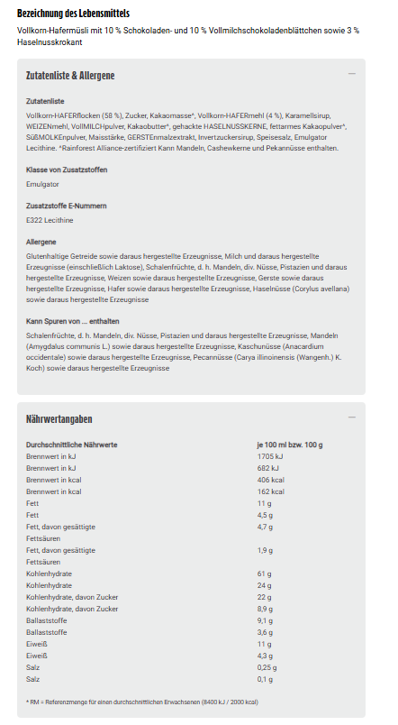 Vollkorn-HAFERflocken (58 %), Zucker, Kakaomasse^, Vollkorn-HAFERmehl (4 %), Karamellsirup, WEIZENmehl, VollMILCHpulver, Kakaobutter^, gehackte HASELNUSSKERNE, fettarmes Kakaopulver^, SüßMOLKEnpulver, Maisstärke, GERSTEnmalzextrakt, Invertzuckersirup, Speisesalz, Emulgator Lecithine. ^Rainforest Alliance-zertifiziert Kann Mandeln, Cashewkerne und Pekannüsse enthalten.