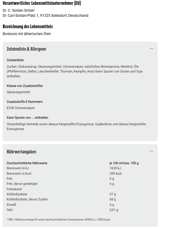 Zucker; Glukosesirup; Säuerungsmittel: Citronensäure; natürliches Birnenaroma; Menthol; Öle (Pfefferminze, Salbei, Latschenkiefer, Thymian, Kampfer, Anis) Kann Spuren von Gluten und Soja enthalten.
