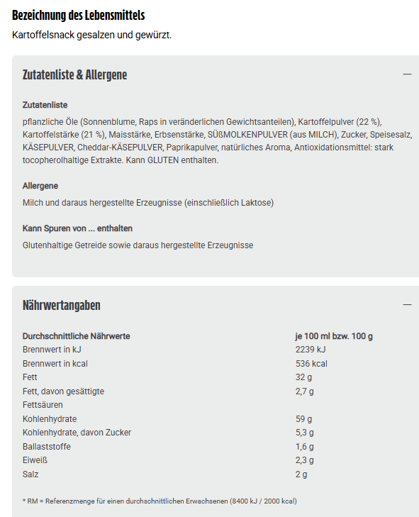 pflanzliche Öle (Sonnenblume, Raps in veränderlichen Gewichtsanteilen), Kartoffelpulver (22 %), Kartoffelstärke (21 %), Maisstärke, Erbsenstärke, SÜßMOLKENPULVER (aus MILCH), Zucker, Speisesalz, KÄSEPULVER, Cheddar-KÄSEPULVER, Paprikapulver, natürliches Aroma, Antioxidationsmittel: stark tocopherolhaltige Extrakte. Kann GLUTEN enthalten.