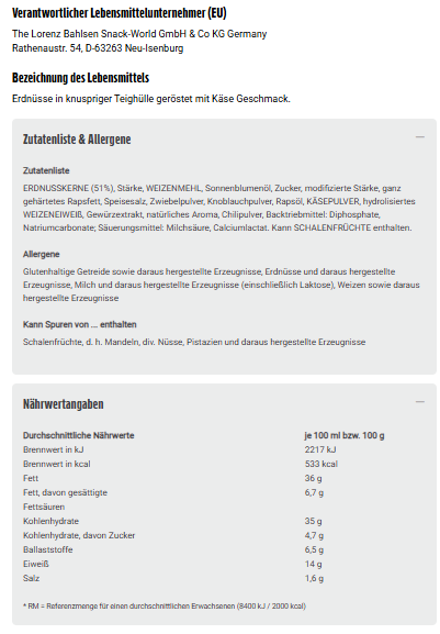 Zutaten: ERDNUSSKERNE (51%), Stärke, WEIZENMEHL, Sonnenblumenöl, Zucker, modifizierte Stärke, ganz gehärtetes Rapsfett, Speisesalz, Zwiebelpulver, Knoblauchpulver, Rapsöl, KÄSEPULVER, hydrolisiertes WEIZENEIWEIß, Gewürzextrakt, natürliches Aroma, Chilipulver, Backtriebmittel: Diphosphate, Natriumcarbonate; Säuerungsmittel: Milchsäure, Calciumlactat. Kann SCHALENFRÜCHTE enthalten.