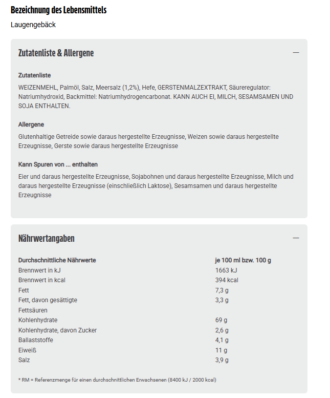 WEIZENMEHL, Palmöl, Salz, Meersalz (1,2%), Hefe, GERSTENMALZEXTRAKT, Säureregulator: Natriumhydroxid, Backmittel: Natriumhydrogencarbonat. KANN AUCH EI, MILCH, SESAMSAMEN UND SOJA ENTHALTEN.