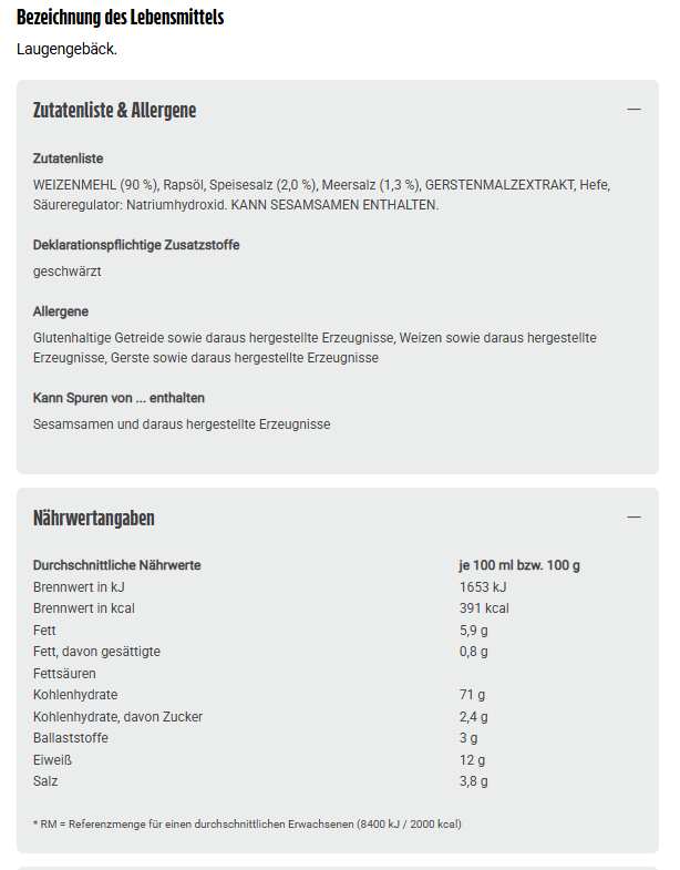 WEIZENMEHL (90 %), Rapsöl, Speisesalz (2,0 %), Meersalz (1,3 %), GERSTENMALZEXTRAKT, Hefe, Säureregulator: Natriumhydroxid. KANN SESAMSAMEN ENTHALTEN.