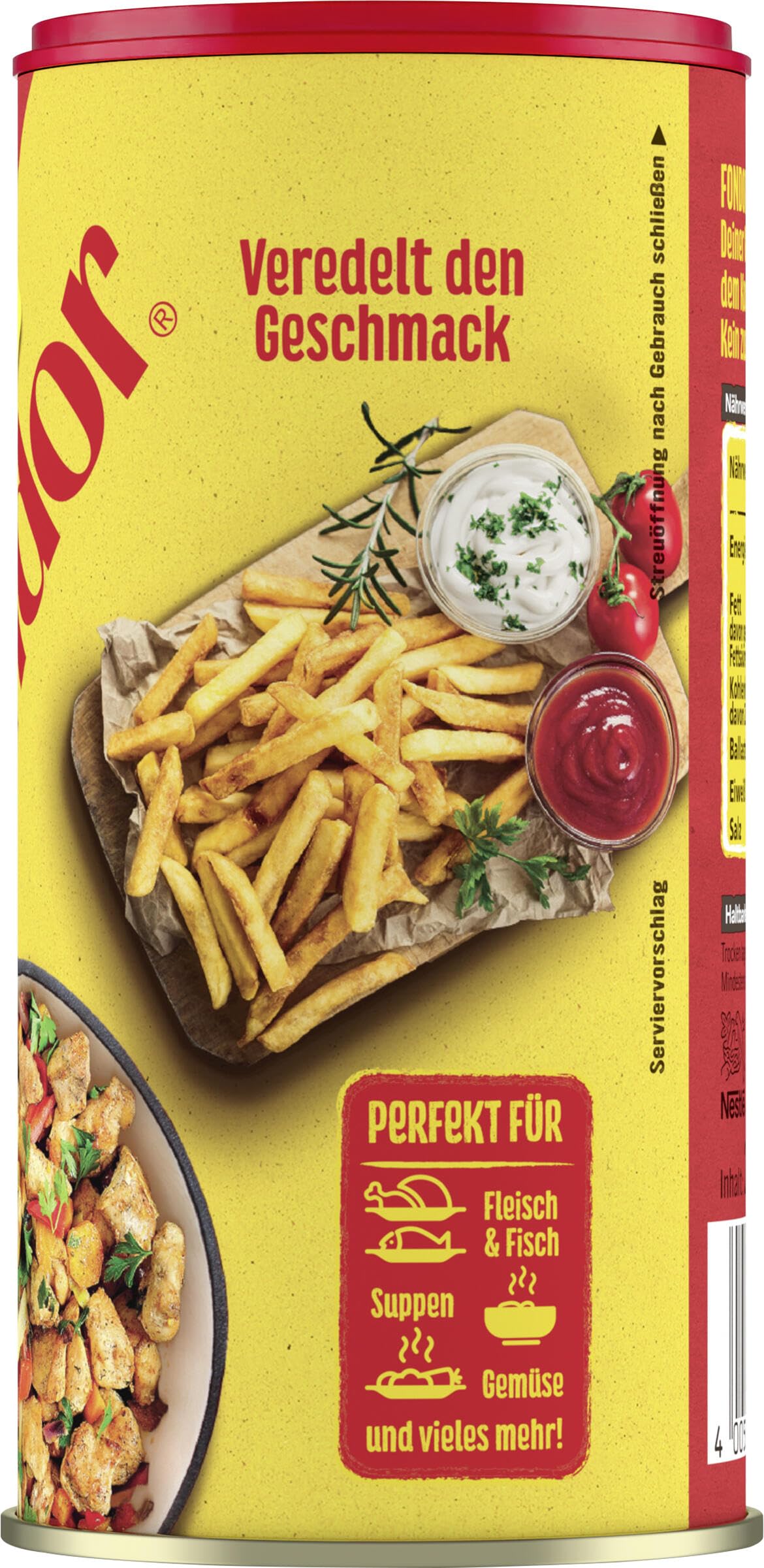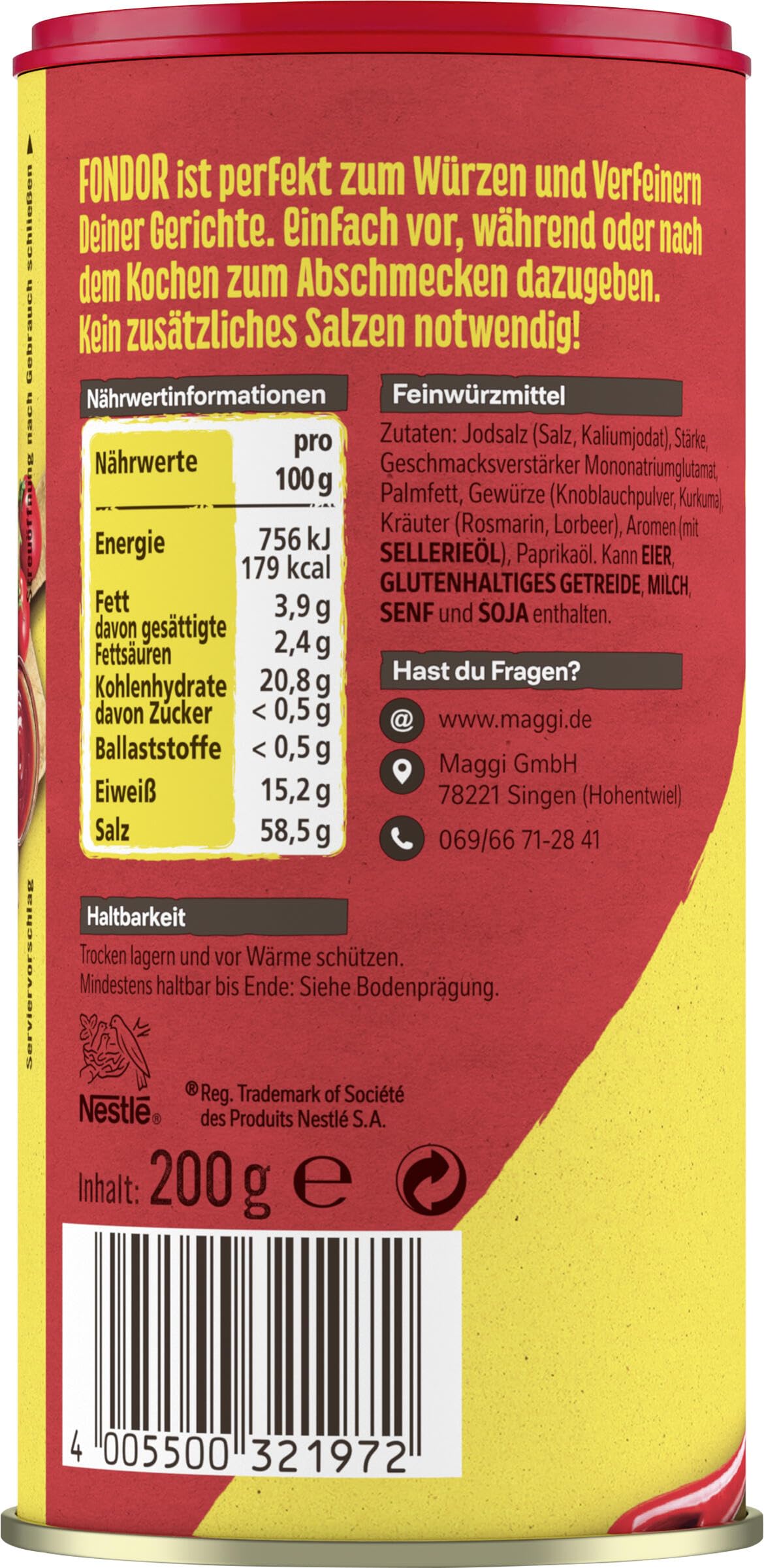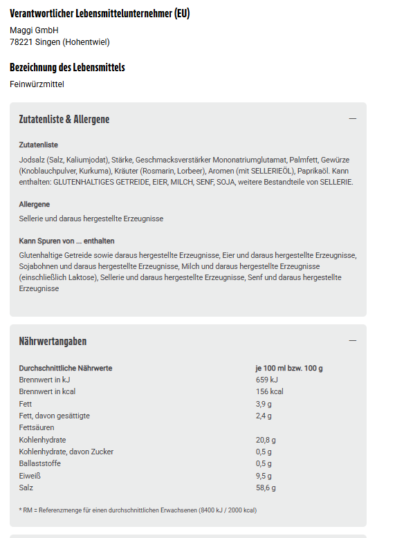 Jodsalz (Salz, Kaliumjodat), Stärke, Geschmacksverstärker Mononatriumglutamat, Palmfett, Gewürze (Knoblauchpulver, Kurkuma), Kräuter (Rosmarin, Lorbeer), Aromen (mit SELLERIEÖL), Paprikaöl. Kann enthalten: GLUTENHALTIGES GETREIDE, EIER, MILCH, SENF, SOJA, weitere Bestandteile von SELLERIE.