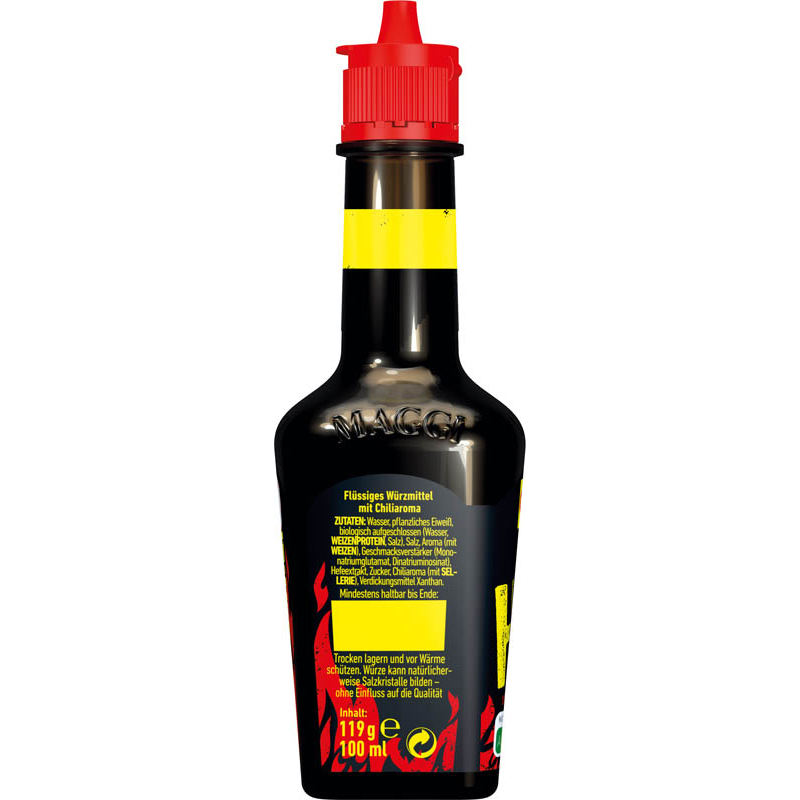 Zutaten: Wasser, pflanzliches Eiweiß, biologisch aufgeschlossen (Wasser, WEIZENPROTEIN, Salz), Salz, Aroma (mit WEIZEN), Geschmacksverstärker (Mononatriumglutamat, Dinatriuminosinat), Hefeextrakt, Zucker, Chiliaroma (mit SELLERIE), Verdickungsmittel Xanthan.