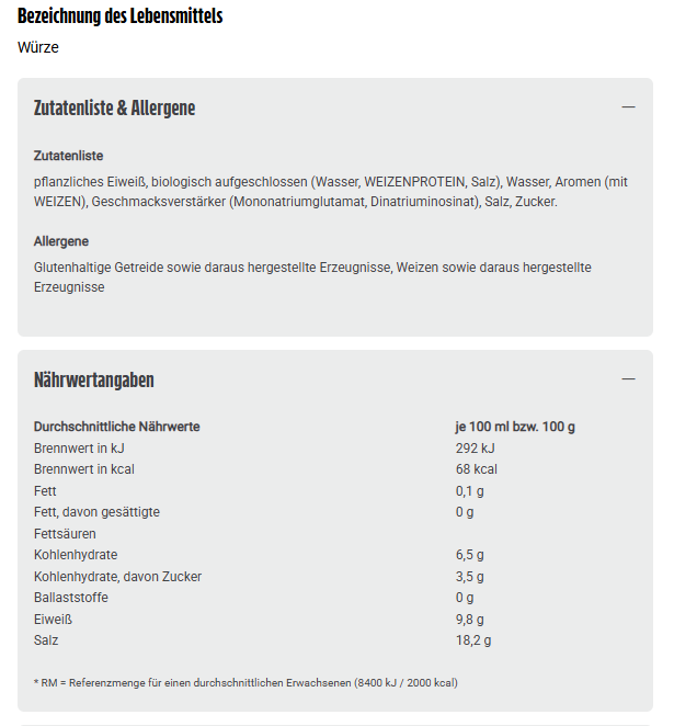 pflanzliches Eiweiß, biologisch aufgeschlossen (Wasser, WEIZENPROTEIN, Salz), Wasser, Aromen (mit WEIZEN), Geschmacksverstärker (Mononatriumglutamat, Dinatriuminosinat), Salz, Zucker.