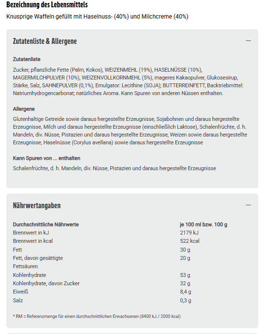 Zucker, pflanzliche Fette (Palm, Kokos), WEIZENMEHL (19%), HASELNÜSSE (10%), MAGERMILCHPULVER (10%), WEIZENVOLLKORNMEHL (5%), mageres Kakaopulver, Glukosesirup, Stärke, Salz, SAHNEPULVER (0,1%), Emulgator: Lecithine (SOJA); BUTTERREINFETT, Backtriebmittel: Natriumhydrogencarbonat; natürliches Aroma. Kann Spuren von anderen Nüssen enthalten.
