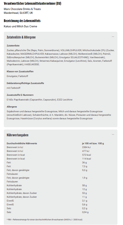 Zucker, pflanzliche Öle (Raps, Palm, Sonnenblume), VOLLMILCHPULVER, Milchschokolade (5%) (Zucker, Kakaobutter, MAGERMILCHPULVER, Kakaomasse, Laktose (MILCH), Molkeneiweiß (MILCH), Palmöl, Süßmolkenpulver (MILCH), Butterreinfett (MILCH), Emulgator SOJALECITHINE), Vanilleextrakt), Maltodextrin, Laktose (MILCH), fettarmes Kakaopulver, Emulgator (Lecithine), Salz, Aromen, Farbstoff (Paprikaextrakt), HASELNÜSSE.