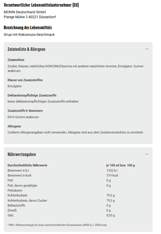 Zucker, Wasser, natürliches KOKOSNUSSaroma mit anderen natürlichen Aromen, Emulgator: Gummi arabicum.