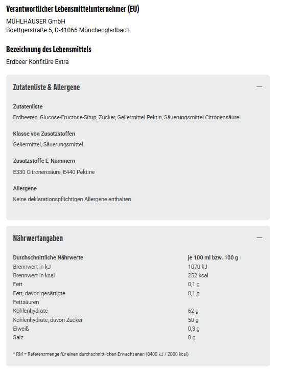 Erdbeeren, Glucose-Fructose-Sirup, Zucker, Geliermittel Pektin, Säuerungsmittel Citronensäure
