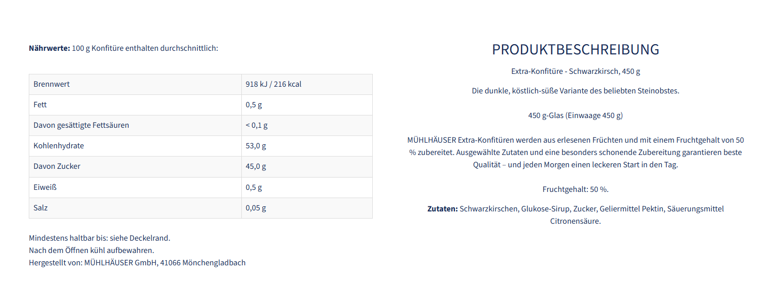Zutaten: Schwarzkirschen, Glukose-Sirup, Zucker, Geliermittel Pektin, Säuerungsmittel Citronensäure.