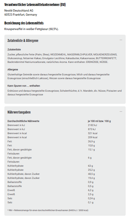 Knusperwaffel in weißer Fettglasur (68,5%).