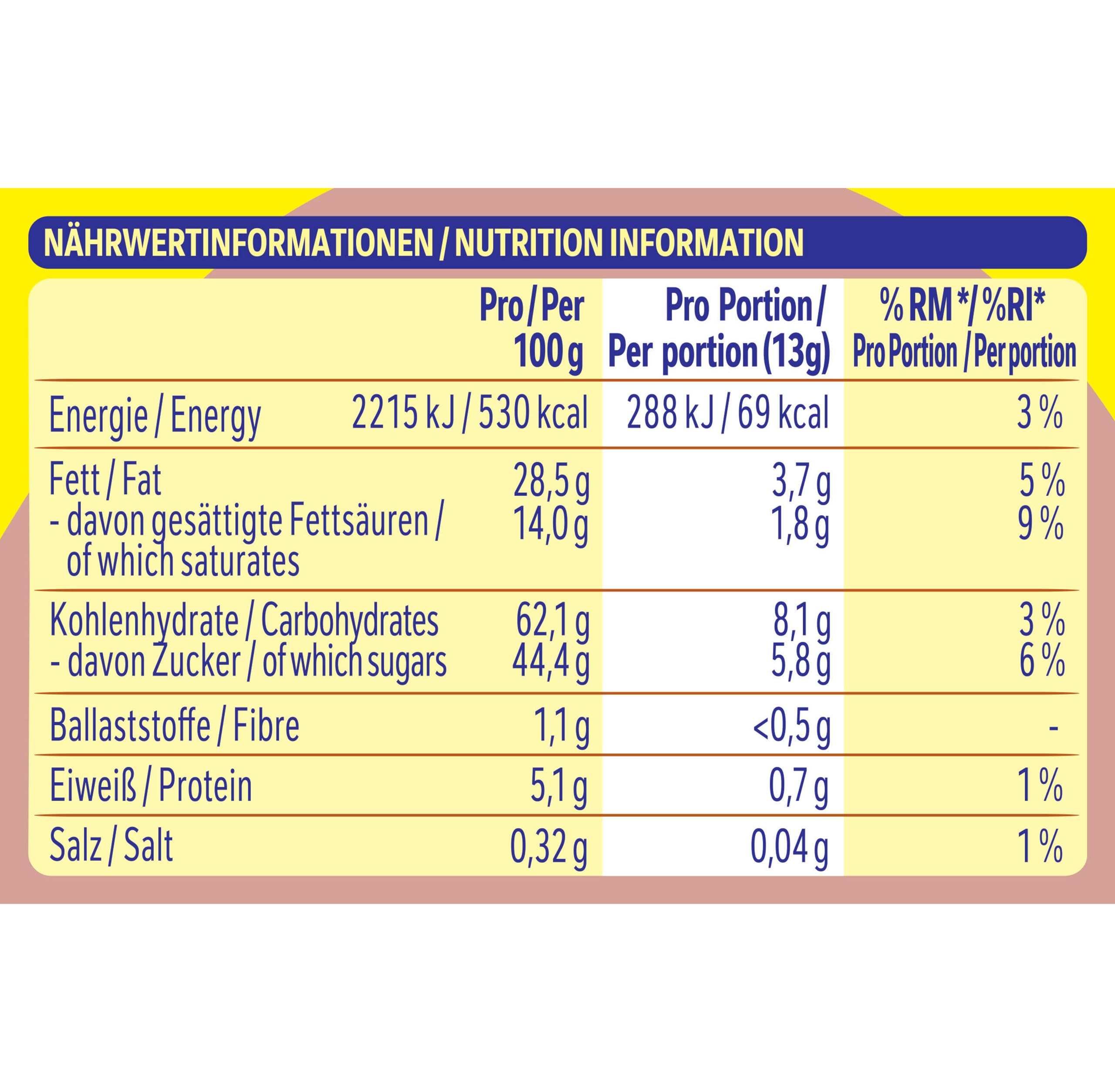 Zucker, WEIZENMEHL, Palmöl, Kakaobutter*, MOLKENERZEUGNIS, Kakaomasse*, VOLLMILCHPULVER, MAGERMILCHPULVER, Stärke, BUTTERREINFETT, Emulgator (E322, E476), Salz, Backtriebmittel (Natriumcarbonate), Aromen. Kann enthalten: NÜSSE, ERDNÜSSE und SOJA. *Rainforest Alliance-zertifiziert.