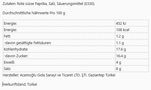 xZutaten: Rote süsse Paprika, Salz, Säuerungsmittel (E330).