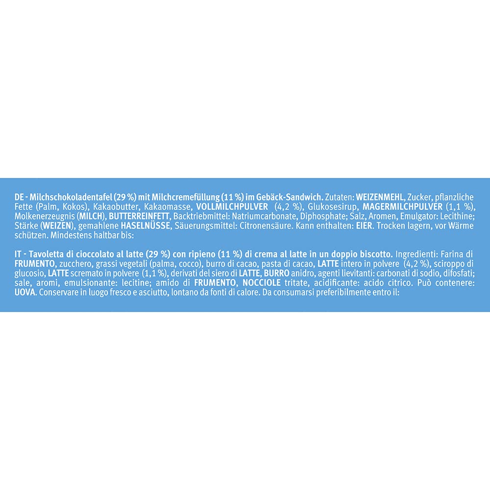 Milchschokoladentafel (29 %) mit Milchcremefüllung (11 %) im Gebäck-Sandwich