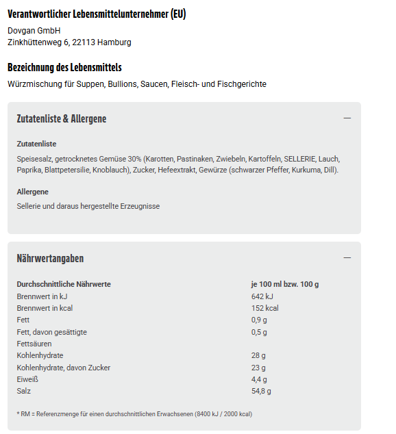Speisesalz, getrocknetes Gemüse 30% (Karotten, Pastinaken, Zwiebeln, Kartoffeln, SELLERIE, Lauch, Paprika, Blattpetersilie, Knoblauch), Zucker, Hefeextrakt, Gewürze (schwarzer Pfeffer, Kurkuma, Dill).
