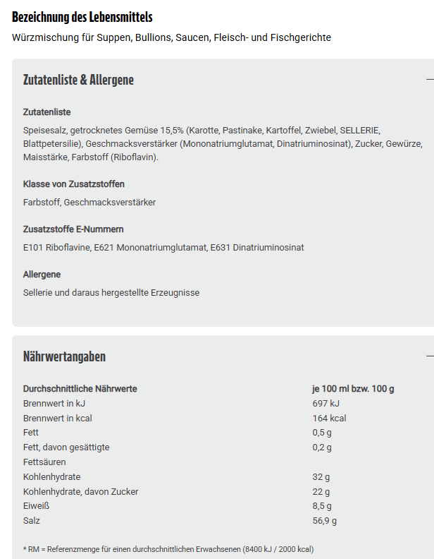 Speisesalz, getrocknetes Gemüse 15,5% (Karotte, Pastinake, Kartoffel, Zwiebel, SELLERIE, Blattpetersilie), Geschmacksverstärker (Mononatriumglutamat, Dinatriuminosinat), Zucker, Gewürze, Maisstärke, Farbstoff (Riboflavin).