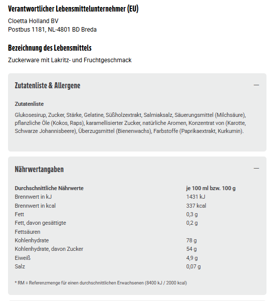 Glukosesirup, Zucker, Stärke, Gelatine, Süßholzextrakt, Salmiaksalz, Säuerungsmittel (Milchsäure), pflanzliche Öle (Kokos, Raps), karamellisierter Zucker, natürliche Aromen, Konzentrat von (Karotte, Schwarze Johannisbeere), Überzugsmittel (Bienenwachs), Farbstoffe (Paprikaextrakt, Kurkumin).