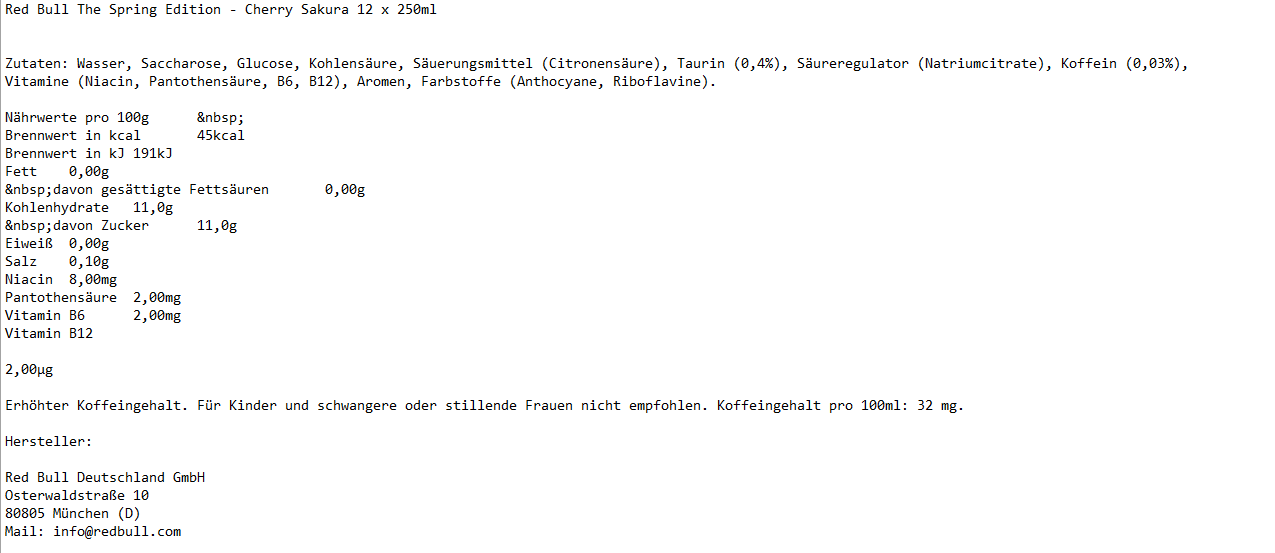Zutaten: Wasser, Saccharose, Glucose, Kohlensäure, Säuerungsmittel (Citronensäure), Taurin (0,4%), Säureregulator (Natriumcitrate), Koffein (0,03%), Vitamine (Niacin, Pantothensäure, B6, B12), Aromen, Farbstoffe (Anthocyane, Riboflavine).
