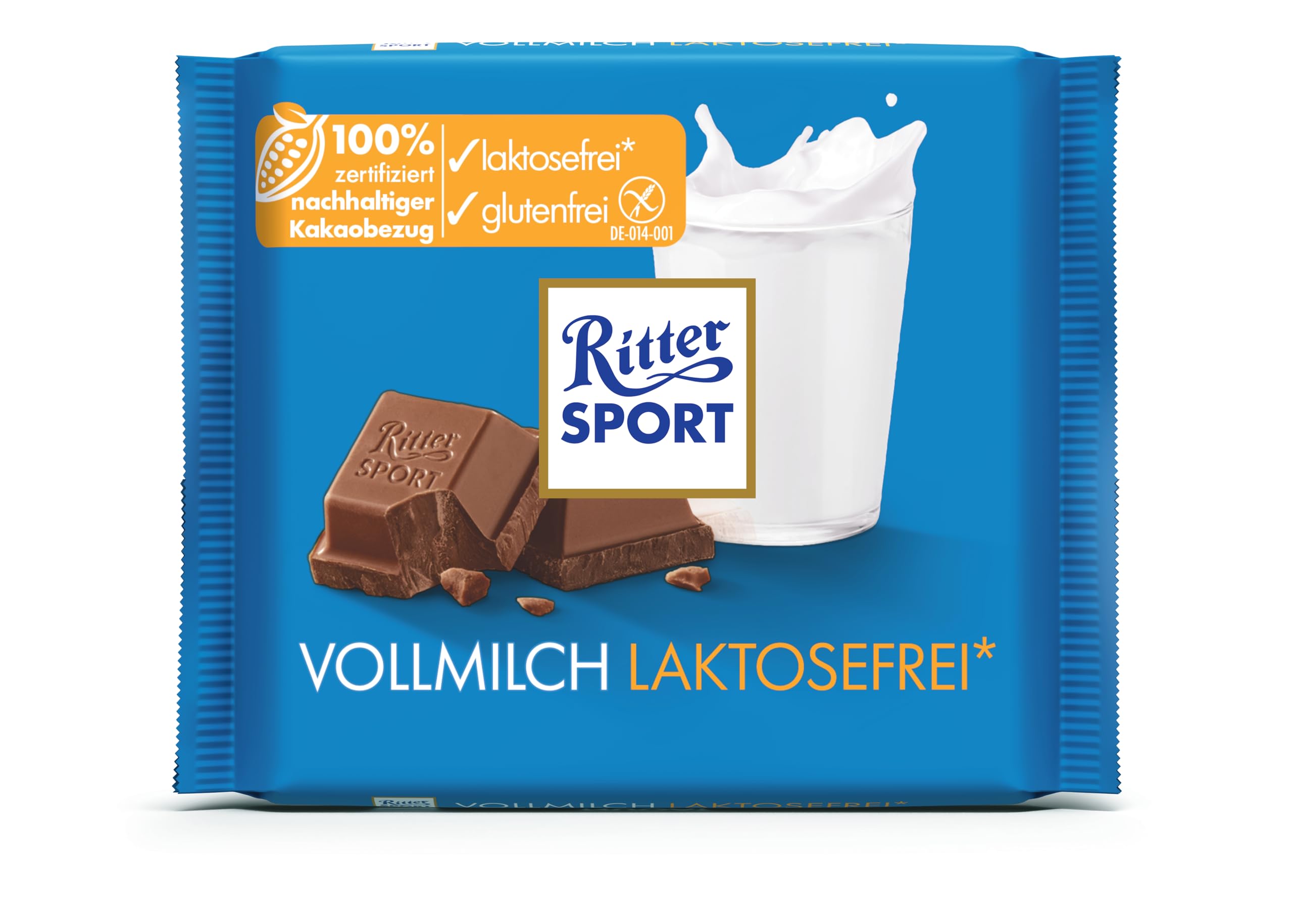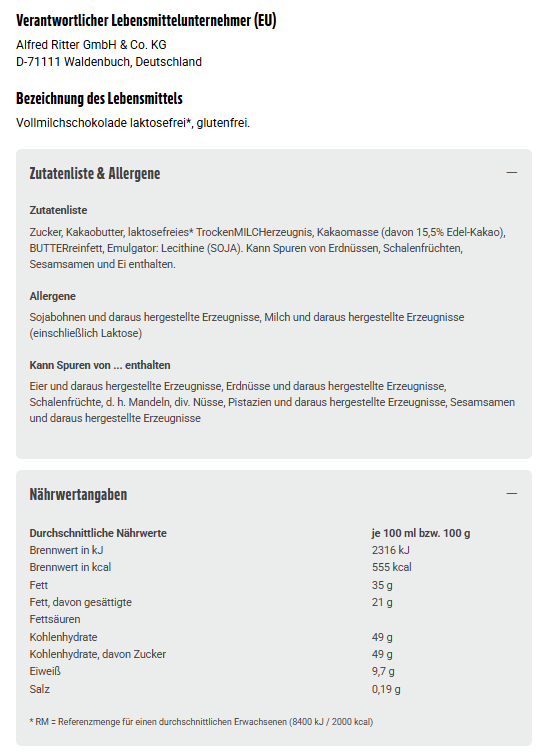 Vollmilchschokolade laktosefrei*, glutenfrei.