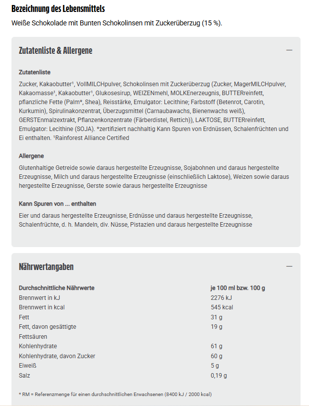 Zucker, Kakaobutter¹, VollMILCHpulver, Schokolinsen mit Zuckerüberzug (Zucker, MagerMILCHpulver, Kakaomasse¹, Kakaobutter¹, Glukosesirup, WEIZENmehl, MOLKEnerzeugnis, BUTTERreinfett, pflanzliche Fette (Palm*, Shea), Reisstärke, Emulgator: Lecithine; Farbstoff (Betenrot, Carotin, Kurkumin), Spirulinakonzentrat, Überzugsmittel (Carnaubawachs, Bienenwachs weiß), GERSTEnmalzextrakt, Pflanzenkonzentrate (Färberdistel, Rettich)), LAKTOSE, BUTTERreinfett, Emulgator: Lecithine (SOJA). *zertifiziert nachhaltig Kann Spuren von Erdnüssen, Schalenfrüchten und Ei enthalten. ¹Rainforest Alliance Certified