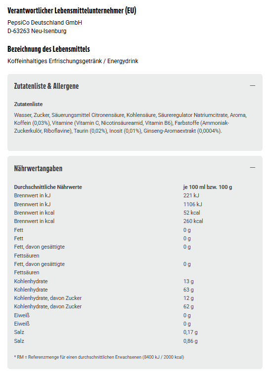Wasser, Zucker, Säuerungsmittel Citronensäure, Kohlensäure, Säureregulator Natriumcitrate, Aroma, Koffein (0,03%), Vitamine (Vitamin C, Nicotinsäureamid, Vitamin B6), Farbstoffe (Ammoniak-Zuckerkulör, Riboflavine), Taurin (0,02%), Inosit (0,01%), Ginseng-Aromaextrakt (0,0004%).